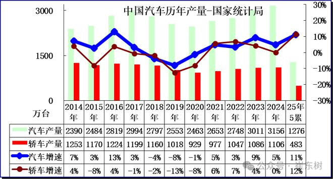 2025年1-5月汽车生产1276万台,同比增11%;新能源汽车生产564万台,同比增41%,渗透率44%;燃油车生产712万台,同比降5%。