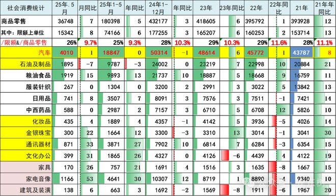 目前看消费不旺的问题稍有改善,5月汽车消费增1%,2025年1-5月汽车消费出现零增长,没有跟上商品零售的平均增速,未来高基数的增长压力仍较大。