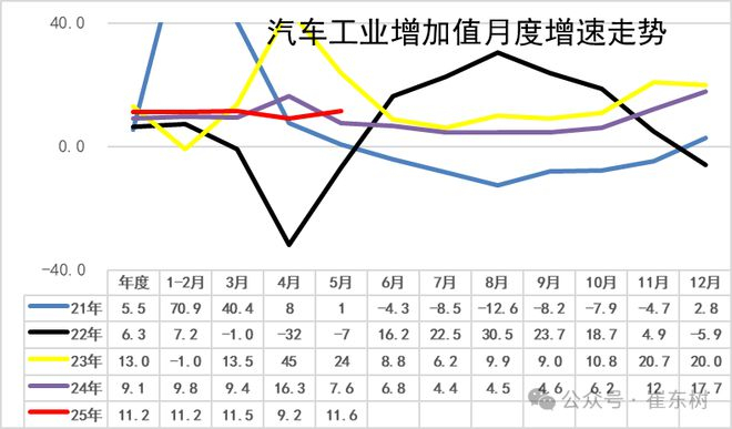 2020年汽车工业增加值增6.6%;2021年增速徘徊在5.5%的水平;2022年的汽车增加值6.3%,较强;2023年汽车业增加值增13%,实现超强增长;2024年的9.1%的汽车增加值相对提升较好。2025年1-5月份的汽车工业增加值增11.2%,5月汽车工业增加值增11.6%,表现较好。