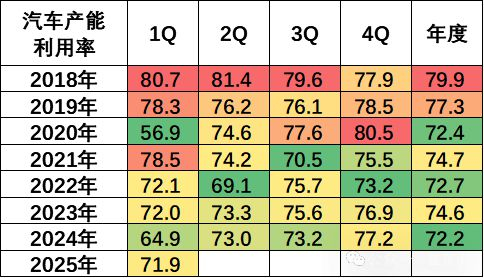 2025年一季度,全国规模以上工业产能利用率为74.1%,比上年同期上升0.5个百分点。2025年1季度汽车行业产能利用率71.9%,较同期上升7个百分点。