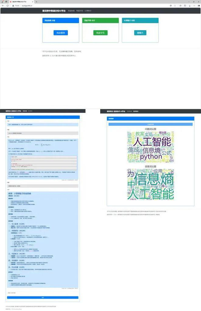 学校构建了三个教学智能体:智能助教“小复”可以帮助教师智能备课、课堂教学、学情分析、作业管理等;智慧学伴“小旦”可以给学生提供个性化教学辅导、实时答疑解惑,并个性化推荐教学资源,同时根据学生问答生成词云图帮助教师实时了解学生学情;心理助手“小青”通过人机交互实现个性化、实时化、情景化的心理咨询辅导,能够对学生情绪波动、心理异常等情况开展预警。