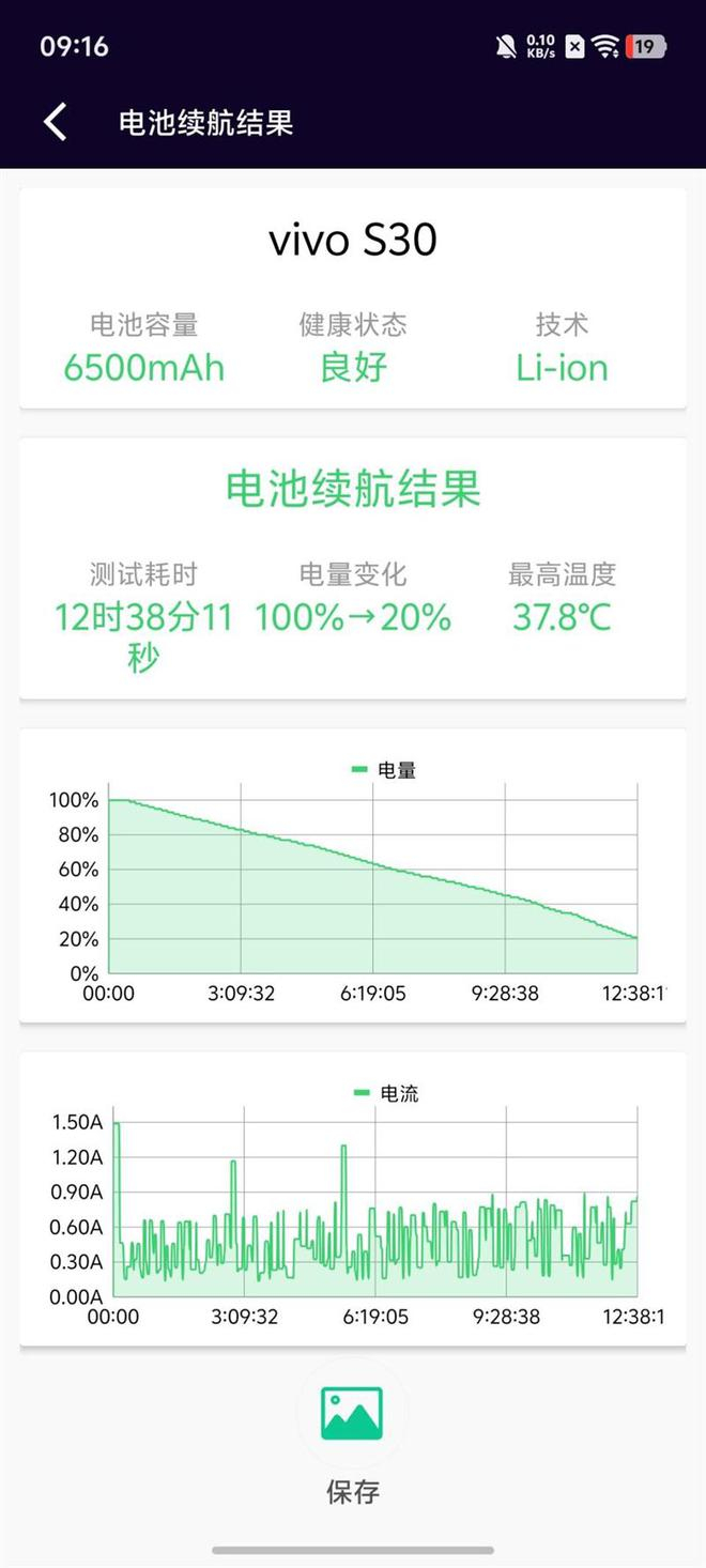 经过电池狗狗续航实测,vivo S30的电量从100%消耗至20%用时12小时38分钟。