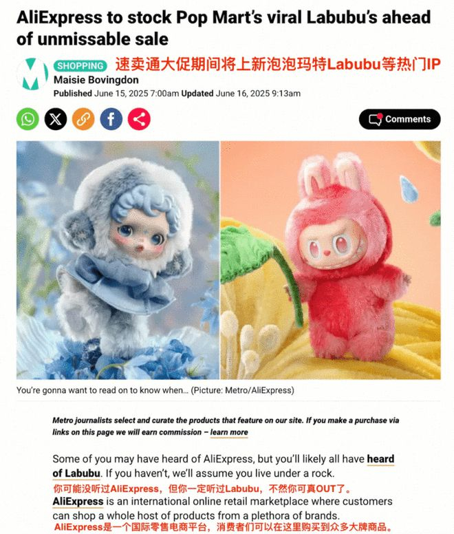 6月17日消息,据英国媒体报道,速卖通AliExpress将于海外618期间发售当下潮玩界顶流Labubu限量版新品,包括盲盒毛绒玩具、钥匙挂件等全新款式,还邀请了海外网红Teala Dunn来到北京泡泡玛特乐园开设专场直播。
