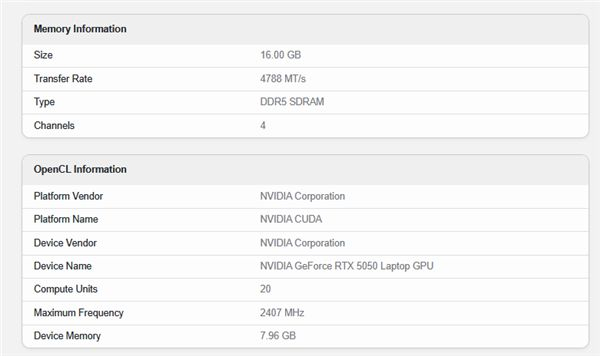 此外,RTX 5050显卡还配备了8GB的显存,这与RTX 4050相同,其加速频率为2.5GHz,与RTX 4050也保持一致。