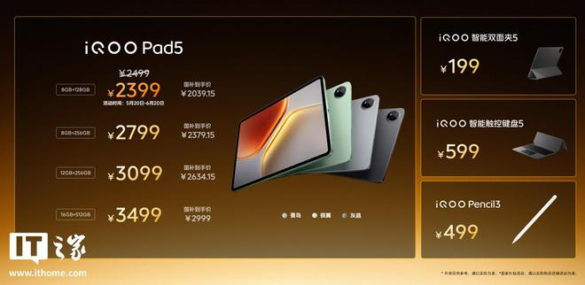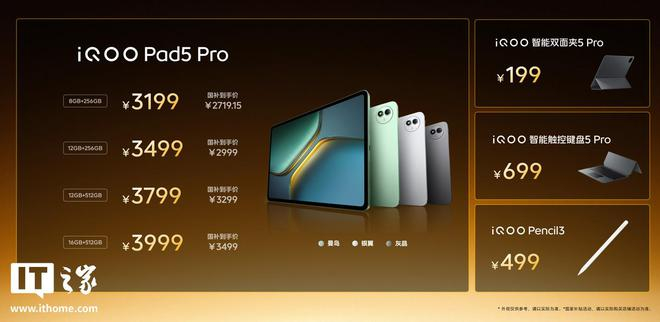 作为比较,iQOO今年5月20日发布的 iQOO Pad5和iQOO Pad5 Pro两款平板电脑,首发价2399/ 3199元起,其中Pro机型搭载联发科天玑9400+处理器,配有13.2英寸3.1K分辨率144Hz高刷1200尼特屏;拥有12050mAh电池,支持66W快充。