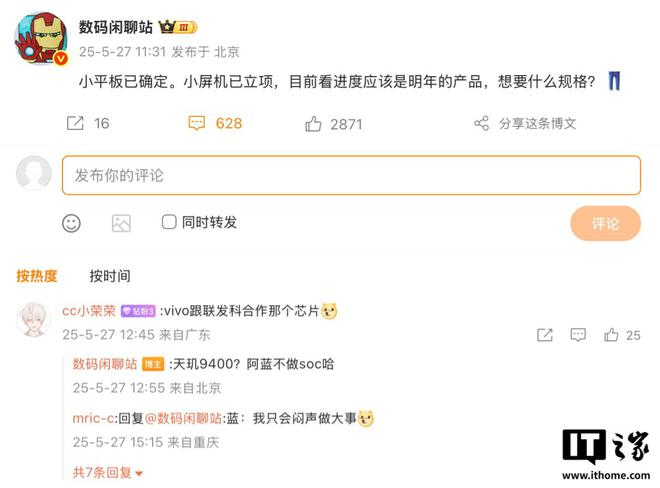 IT之家注意到,该博主@数码闲聊站 上个月曾发文,透露 iQOO 旗下小平板已确定、小屏机已立项,相应产品将在明年发布,此外该博主还在评论区透露 vivo“不做SoC哈”。