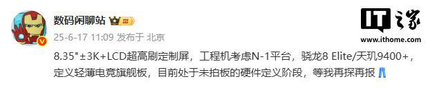 据介绍,这款新品配备 8.35 英寸 LCD 超高刷定制屏,达到约 3K 分辨率,工程机考虑骁龙 8 Elite / 天玑 9400 + 处理器,定义轻薄电竞旗舰板,目前处于未拍板的硬件定义阶段。