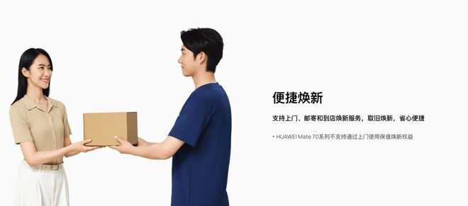 除了折抵优惠外,用户还可以根据自己的需求自由选择三种焕新方式。我的华为 App 可以申请到店焕新,用户完成新机预定后,携带旧机前往线下门店即可享受专业工作人员的面对面服务。不方便到店的用户可以通过华为商城 App 预约上门焕新,工程师携带新机上门并回收旧机。平时工作比较繁忙的用户也可以选择邮寄焕新,新机包邮到家,不需要专门腾出时间。