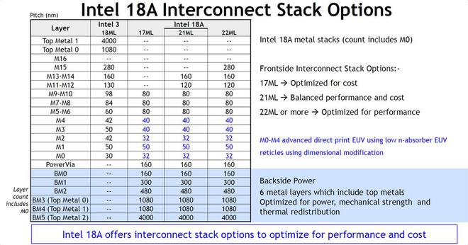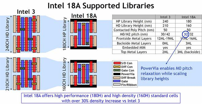 与Intel 3相比,Intel 18A的单元高度在使用高性能设计时从240nm降低至180nm,采用高密度设计则从210nm降低至160mm,而M0/M2间距从30/42nm变成了32/32nm,正面金属层数从Intel 3的12~19层减少到11~16层,并增加了三个背面金属层以支持PowerVia。