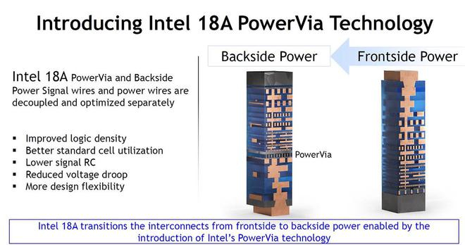 Intel 18A所使用的PowerVia技术也将有助于改善下一代晶体管的功率传输,改技术采用背面电源信号线而非正面电源信号线。这线新线路被分离并分别进行最佳化,从而实现更高的逻辑密度、更好的标准单元利用率、更低的信号RC、减少电压降并提高设计弹性。