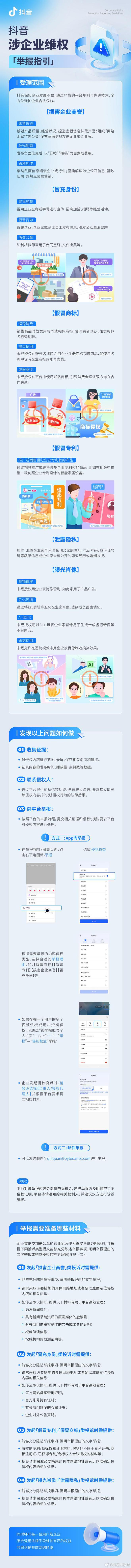 平台深知企业经营发展不易,面对网络侵权行为,如何高效维权是不少企业的痛点。抖音特别整理了一份企业维权“举报指引”,列举了平台可受理的常见涉企侵权类型,以及企业可通过哪些方式向平台提交举报,不同侵权场景需准备哪些举报材料等,希望企业遭遇“不知如何下手”的侵权问题时,能快速通过合理手段精准反击,维护自身合法权益。