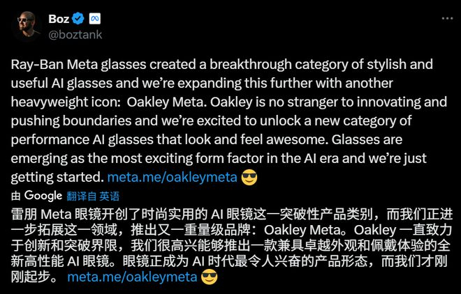 AI眼镜发布后,Meta CTO在X平台发文称,这是一款兼具外观和佩戴体验的高性能AI眼镜,眼镜正成为AI时代最令人兴奋的产品形态,我们才刚刚起步。