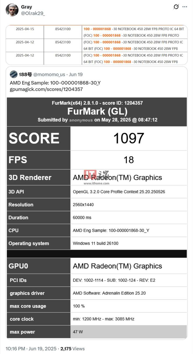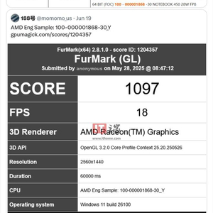 IT之家 6 月 22 日消息,X 平台消息人士 188 号 (@momomo_us) 本月 19 日分享了一张图片: AMD 的一款工程样品处理器在 FurMark 2 中以 OpenGL API 在 1440p 下取得了 1097 的跑分成绩。