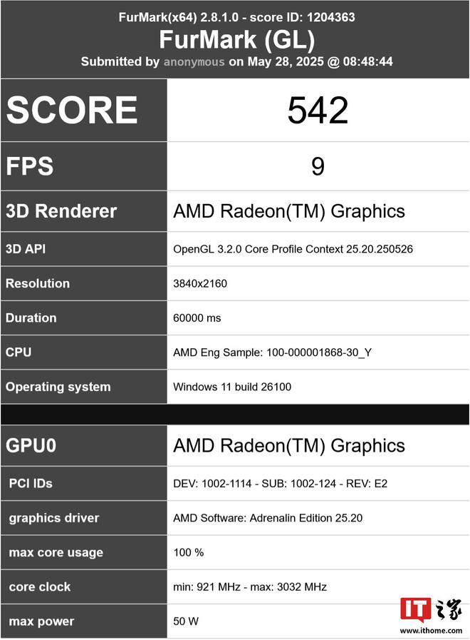 而按照IT之家的进一步搜索,这款名为 "AMD Eng Sample: 100-000001868-30_Y" 的处理器也出现在另一份 OpenGL API、2160p 的 FurMark 2 跑分中: