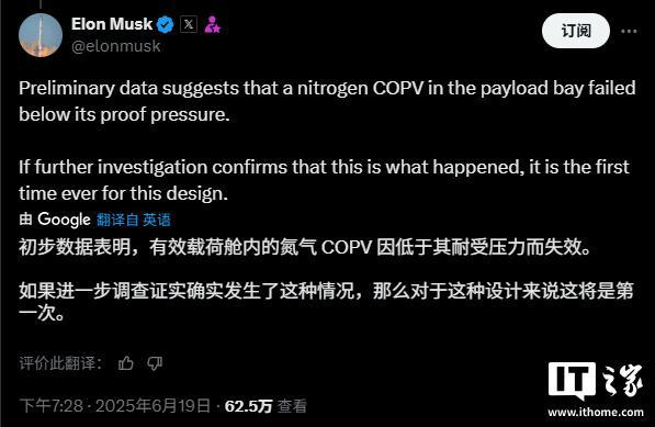 马斯克在事件发生后不久便分享了一些信息。在回复太空爱好者 @Erdayastronaut 的帖子时,马斯克表示:“初步数据表明,载荷舱内的氮气 COPV 在其验证压力以下发生了故障。”他还指出:“如果进一步调查证实了这一点,这将是这种设计首次出现此类情况。”
