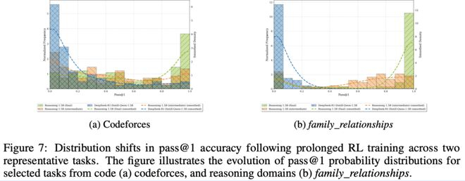 图7(a)和图7(b)展示了在代码任务和逻辑谜题任务中的pass@1分布变化: