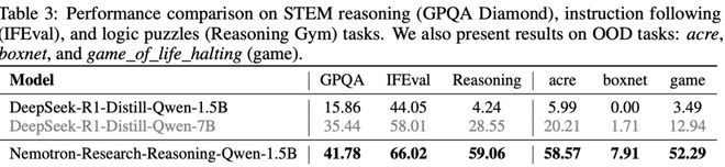 借助稳定的奖励计算机制、改进版GRPO算法以及延长的训练过程,在不同任务上,新模型Nemotron-Research-Reasoning-Qwen-1.5B都展现出强大的泛化能力。