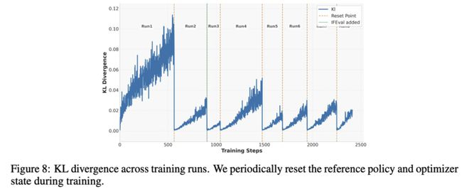 当验证集表现停滞或下降时,他们会对参考模型和优化器进行硬性重置,以恢复训练稳定性,并允许策略进一步偏离初始基础模型。