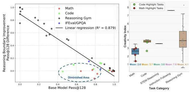 结果表明,那些在RL训练后几乎没有提升的任务,其创造力指数普遍较低——