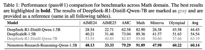 在多个领域对DeepSeek-R1-Distill-Qwen-1.5B基础模型与Nemotron-Research-Reasoning-Qwen-1.5B,研究团队进行了全面对比。