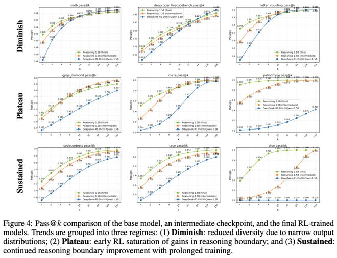他们逐一分析了各个评估基准任务的训练表现,并根据训练过程中pass@k的变化趋势,把它们分类。