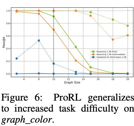 这一结果强有力地支持了以下结论:ProRL不仅提升模型在已知任务上的表现,更促使模型内化抽象的推理模式,具备超越具体训练数据与任务复杂度的泛化能力。