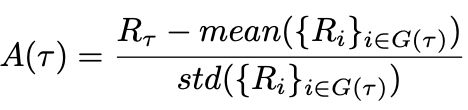 GRPO中的优势函数(advantage)不依赖于PPO的价值网络(critic),而是用同一组样本{Ri}的得分来估算基线: