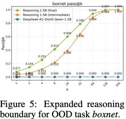 (3)强化学确实可以扩展LLM推理边界,能够推广到训练中未见的分布外任务。