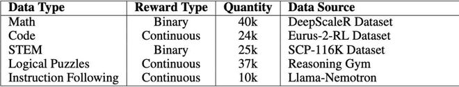 为了验证假设,研究团队构建了多样化且可验证的训练数据集,共包含约13.6万个样本,涵盖五个任务领域:数学(math)、编程(code)、理工类(STEM)、逻辑谜题(logical puzzles)和指令遵循(instruction following)。