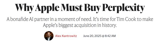 对此, Big Technology创始人、 WrapPRO撰稿人Alex Kantrowitz专门写下一篇名为《为什么苹果必须收购Perplexity》的文章。