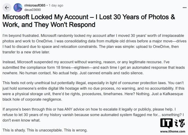 IT之家 6 月 22 日消息,Reddit 用户 @deus03690 发帖称其非常郁闷,其 30 年来积累的无数“珍贵照片和工作资料”因为 OneDrive账户被微软无预警、无理由冻结而完全无法访问。