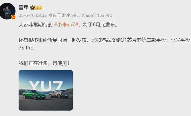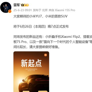 6月16日周一早 间 ,雷军正式官宣,小米YU7将于6月底上市,但并未发布具体时间。
