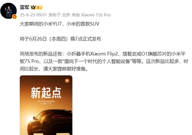 电动知家消息,6月23日,小米董事长雷军正式宣布,小米的首款SUV将于6月26日(本周四)晚7点正式发布。