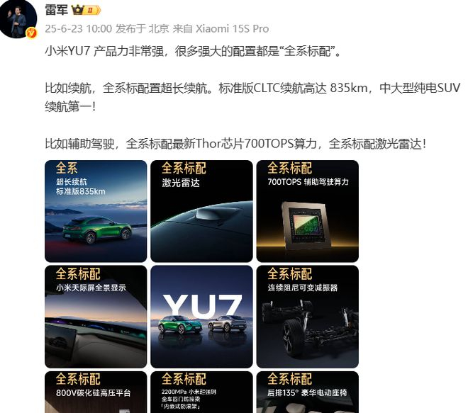此后雷军再次发文称,小米YU7 产品力非常强,很多强大的配置都是“全系标配”。比如续航,全系标配置超长续航。标准版CLTC续航高达 835km,中大型纯电SUV续航第一!比如辅助驾驶,全系标配最新Thor芯片700TOPS算力,全系标配激光雷达!