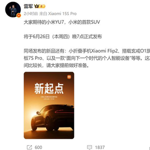 6月23日,雷军发布微博称,大家期待的小米YU7,小米的首款SUV将于6月26日(本周四)晚7点正式发布。同场发布的新品还有:小折叠手机Xiaomi Flip2、搭载玄戒O1旗舰芯片的小米平板7S Pro、以及一款“面向下一个时代的个人智能设备”等等。