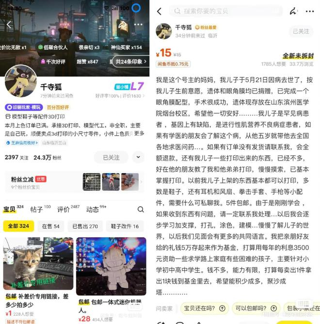 《赛博朋克2077》玩家圈中,"千寺狐"的闲鱼小店一直以精巧的3D打印模型零件闻名。2022年5月,不幸的消息传来,店主因病离世。不久后网友们却发现,这家店铺又开始上新了。原来,是年过半百的母亲接过了儿子的账号,她想试图通过儿子的闲鱼店铺,理解他生前的兴趣爱好,店铺商品描述也被更改为“儿子设计的模型,妈妈代发货”。