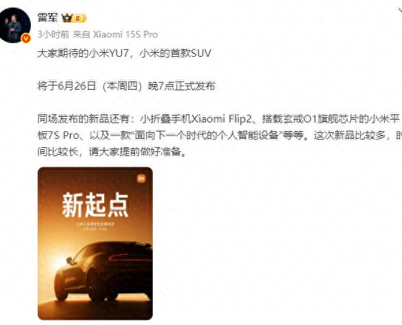 【环球网科技综合报道】6月23日,小米创办人、董事长兼 CEO 雷军在个人社交平台上宣布,6 月 26 日的小米人车家全生态发布会上,除了小米 YU7、小折叠手机 Xiaomi Flip2、搭载玄戒O1旗舰芯片的小米平板 7S Pro,还将有一款“面向下一个时代的个人智能设备”。他表示,这次新品比较多,时间比较长,请大家提前做好准备。