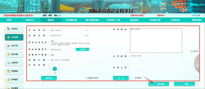 同时,会员也可自主挂牌声音资产:进入“作品挂牌”板块,填写作品名称、存续年限、挂牌价格等信息,上传声音文件与封面,确认无误后点击“确认挂牌”,即可完成资产上架流程。