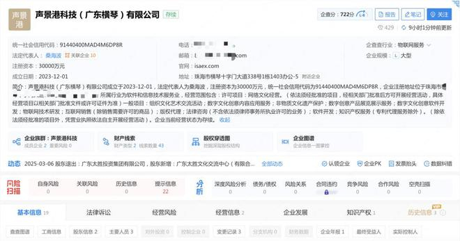 此外,记者注意到该平台运营主体为声景港科技(广东横琴)有限公司。据企查查数据显示:该公司成立于2023年12月,注册资本3亿元,法定代表人为桑海波,经营范围覆盖数字文化创意开发、物联网技术研发、知识产权服务等领域,为声音资产的交易流通与产业转化提供全链路支撑。