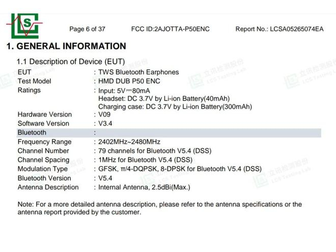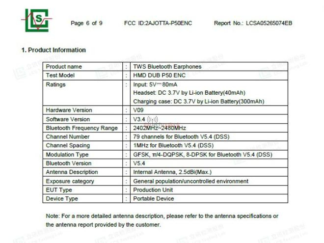 HMD DUB P50 ENC 耳机认证公示:40/300mAh 电池,支持蓝牙 5.4