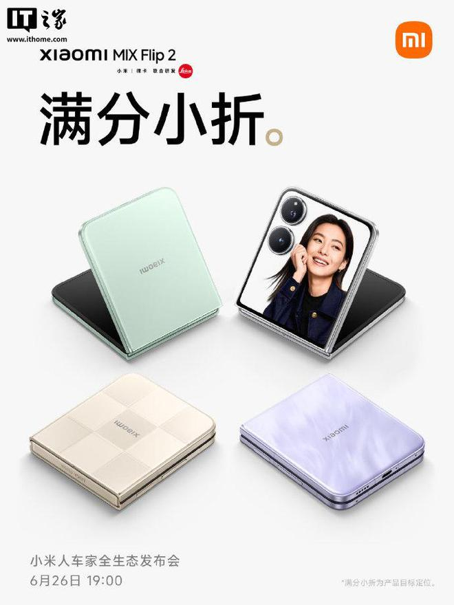 IT之家 6 月 24 日消息,小米将于 6 月 26 日晚 7 点举行人车家全生态发布会,届时将推出的新品包括小米 MIX Flip 2 小折叠手机,今天官方公布了该机的外观和重要配置信息。