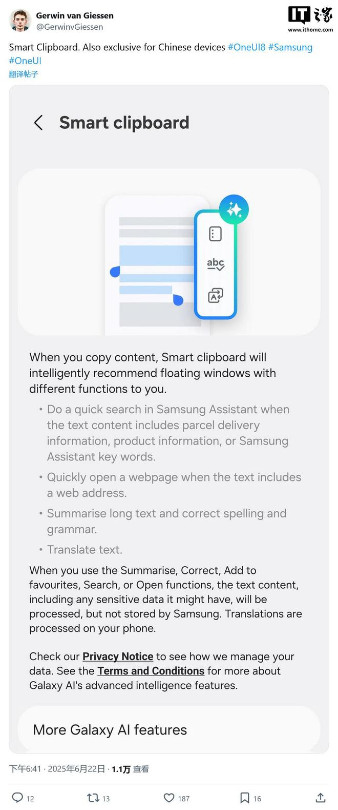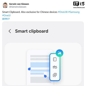 IT之家 6 月 24 日消息,消息源 @GerwinvGiessen 于 6 月 22 日在 X 平台发布推文,曝料称三星计划在 One UI 8 系统中,引入智能剪贴板(Smart Clipboard)功能,且为中国地区用户独享。