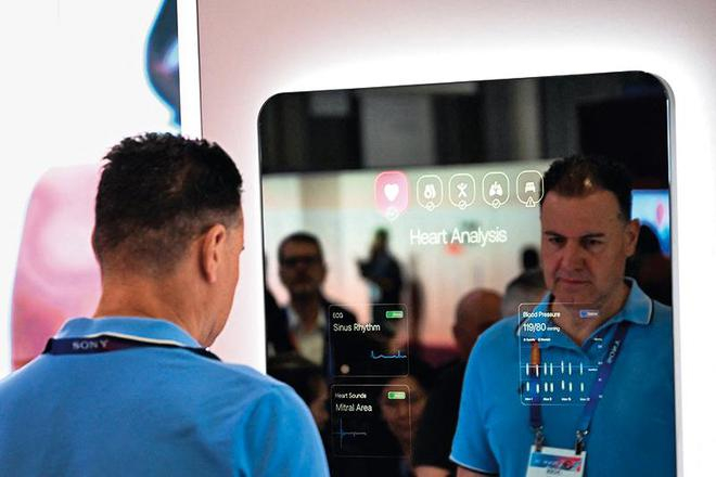 在美国拉斯维加斯举行的消费电子展上,一名男子观看一个智能镜(2025 年 1 月 7 日摄) 新华社 / 法新