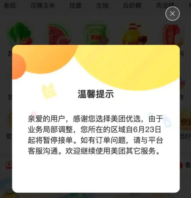 6月23日下午,美团优选被爆突发大面积关仓,系统提示为"由于业务局部调整,您所在的区域自6月23日起将暂停接单。"