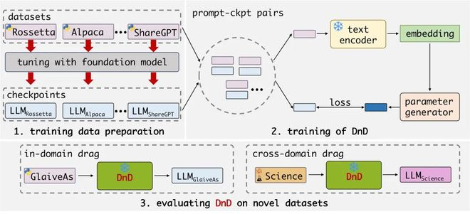 DnD是一种基于提示词的参数生成器,能够对LLM进行无需训练的自适应微调。