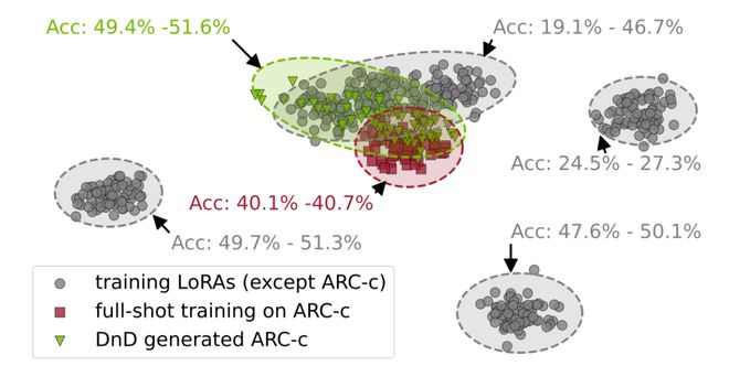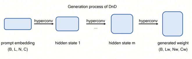 通过一个轻量级文本编码器与一个级联超卷积解码器的组合,DnD能在数秒内,仅根据无标签的任务提示词,生成针对该任务的LoRA权重矩阵。