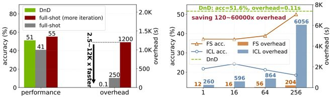 虽然经过更多轮次的迭代,全量微调的性能会超过DnD,但其代价是高达12000倍的推理延迟。