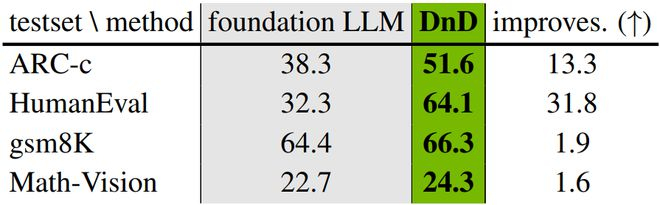 DnD在多种任务上超越了基座LLM,展现出显著的「拖拽」增强效果。