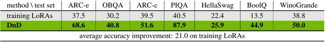 在所有未曾见过的数据集上,DnD在准确率上都显著超越了那些用于训练的LoRA模型。