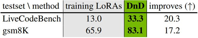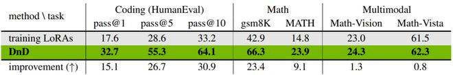 DnD能为数学、代码和多模态问答等更复杂的任务生成参数。